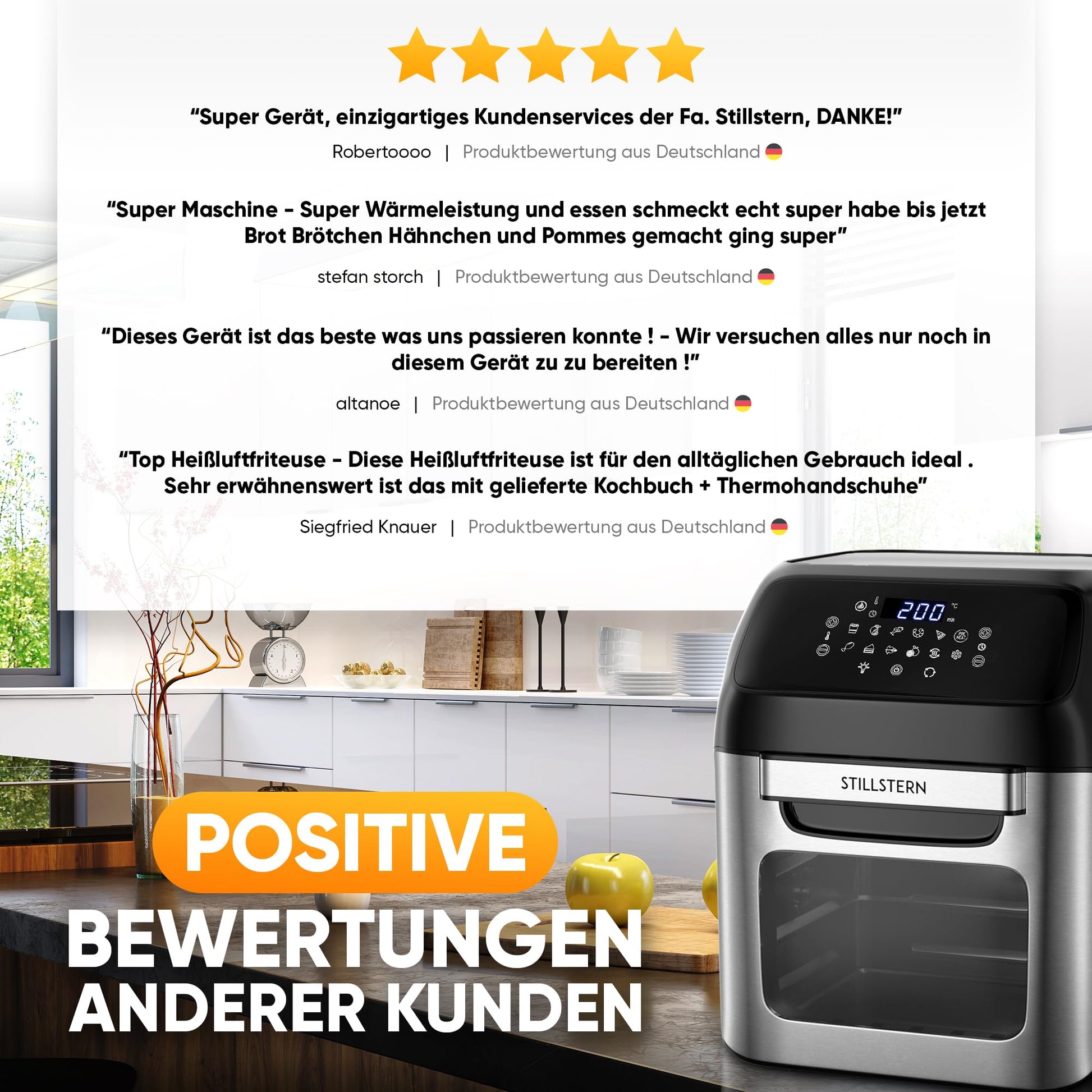- MEHRFACH AUSGEZEICHNET - NOTE ,,SEHR GUT': Der STILLSTERN Airfryer wurde mehrfach unabhängig getestet und für seine geprüfte Qualität, einfache Bedienung und vielseitigen Funktionen mit Bestnoten bewertet - ideal für den täglichen Einsatz in deiner Küche als Heißluftfritteuse.
