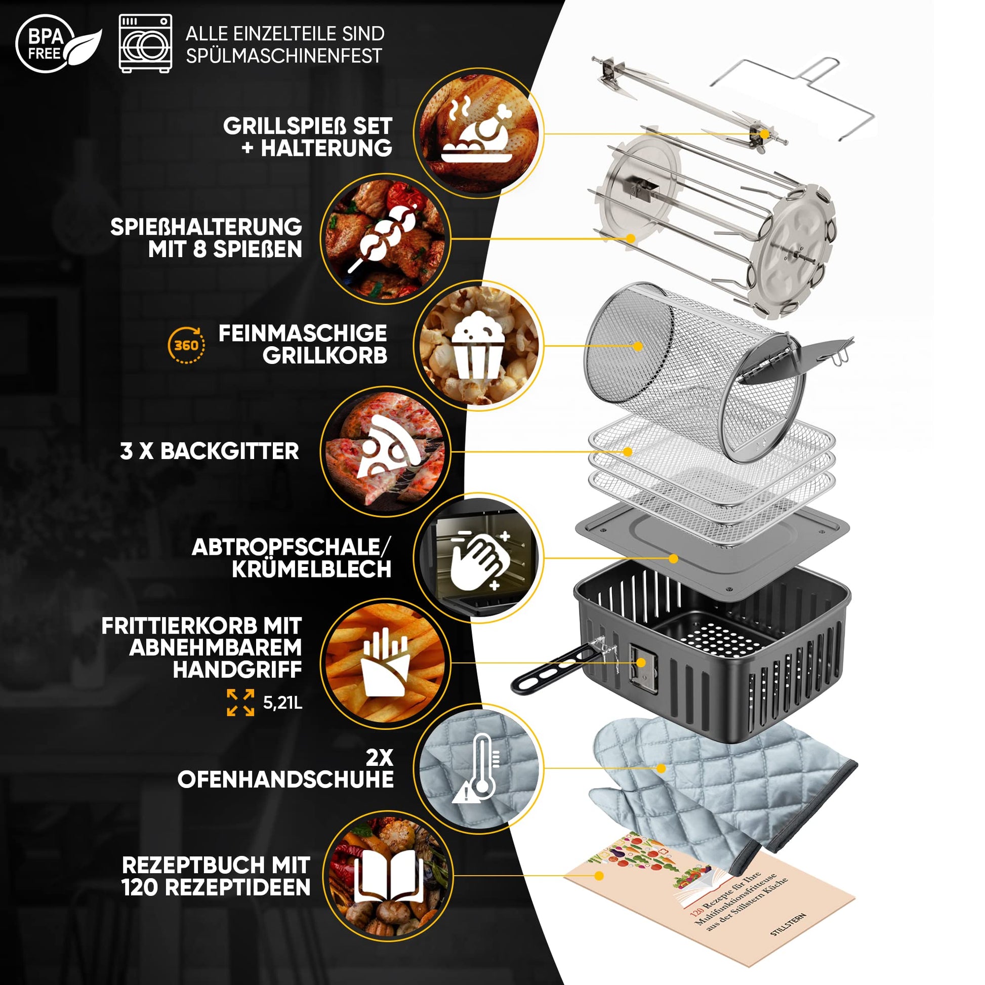 Stillstern Heißluftfritteuse 12L mit LED-Touchscreen, XXL Rezeptbuch auf Deutsch, 12 Programme, Vorheizen&Warmhalten, 1800W Heissluftfritteuse Air Fryer XXL ohne Öl Dörren Minibackofen Camping Grill